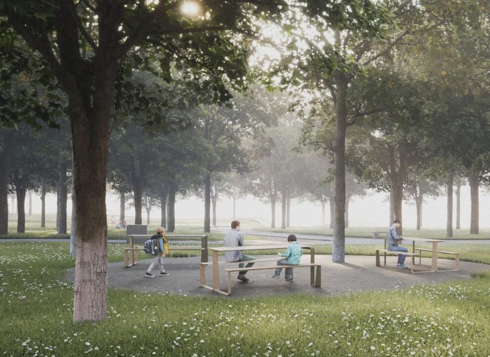Mobilier urban modern: bănci, rasteluri pentru biciclete, cișmele de apă, coșuri pentru colectare selectivă