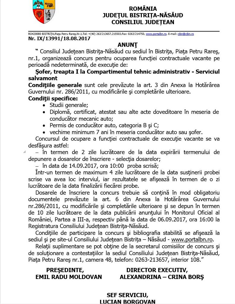 ANUNȚ Consiliul Judeţean Bistriţa-Năsăud cu sediul în Bistriţa, Piaţa Petru Rareş nr. 1, organizează concurs pentru ocuparea unui funcţii contractuale vacante pe perioadă nedeterminată.