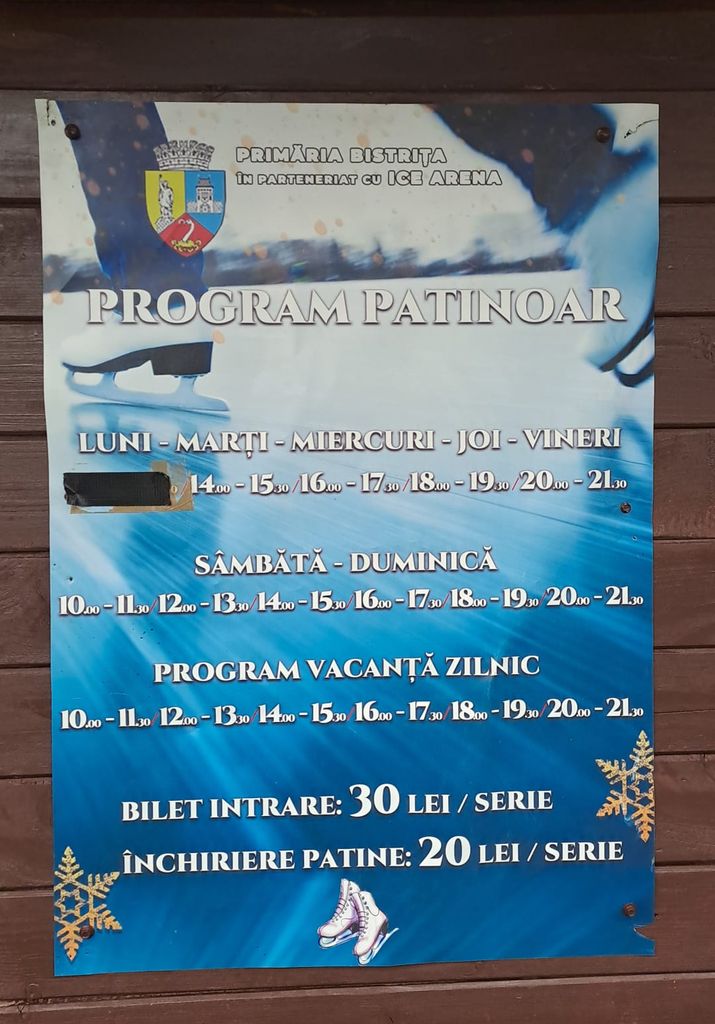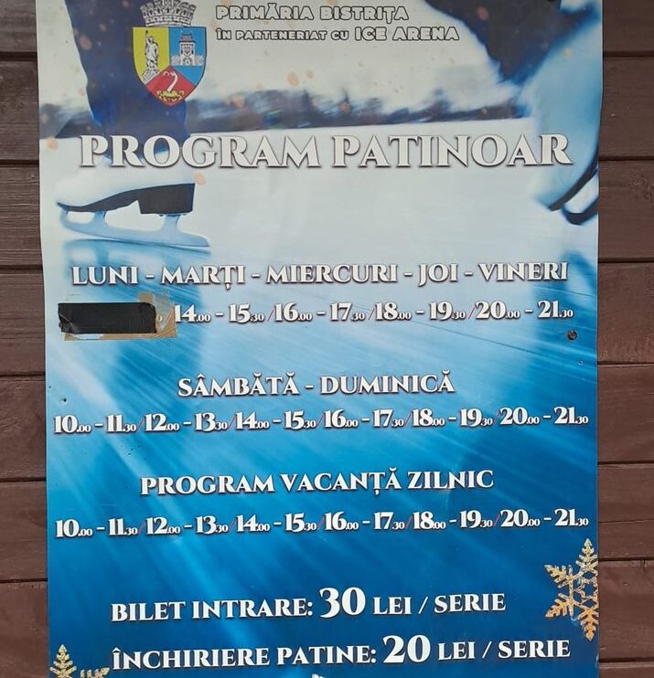 Ice Arena, patinoarul cu gheață artificială amenajat în fața Palatului Culturii din Bistrița, s-a deschis astăzi, 1 Decembrie, la ora 12.00.