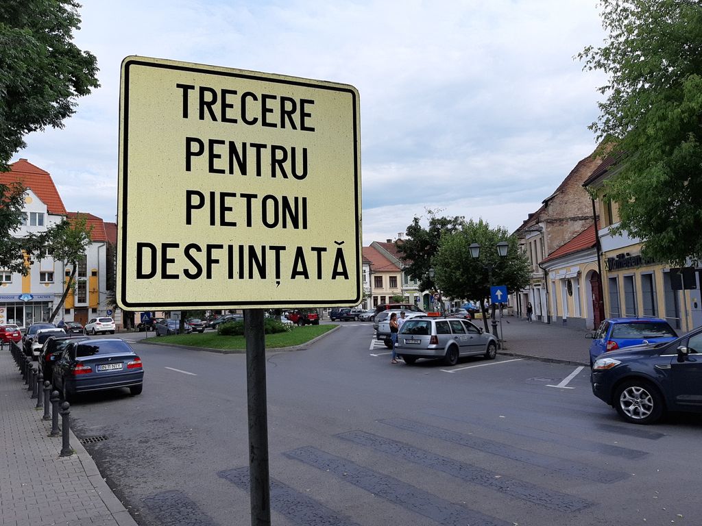 Bistrițenii care circulă prin zona centrală a orașului pot observa că, în locul trecerii de pietoni din fața sediului unei bănci, a apărut o plăcuță pe care scrie ”Trecere pentru pietroni desființată”. Cei care vor să traverseze strada o pot face câțiva metri mai încolo.
