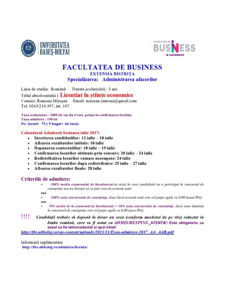 La Facultatea de Business, unde sunt 75 de locuri din care 9 la buget şi 66 cu taxă, admiterea se va desfăşura în condiţiile următoare: