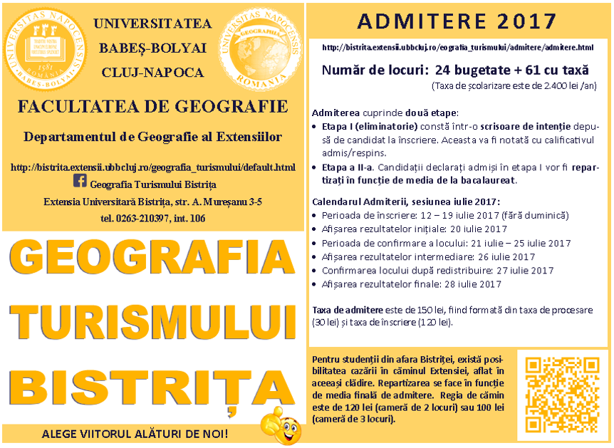La Facultatea de Geografia Turismului unde sunt 24 de locuri bugetate şi 61 cu taxă, criteriile de admitere le găsiţi în imaginea de mai jos.