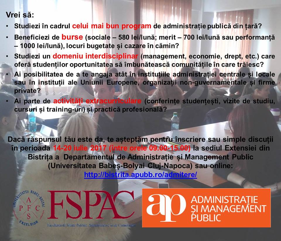 La Facultatea de Administraţie Publică unde sunt 21 de locuri la buget, 75 cu taxă, se pot înscrie absolvenți de liceu (indiferent de promoție), criteriul de departajare fiind media examenului de bacalaureat cu pondere de 100%, iar la licenţiaţi media examenului de licență.