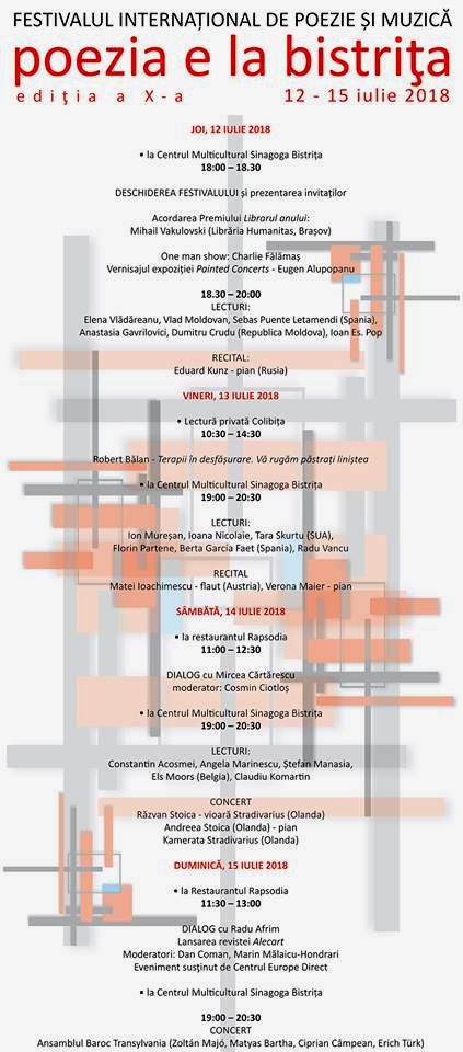 În 12-15 iulie are loc ediția 2018 a Festivalului internațional de poezie și muzică de cameră ”Poezia e la Bistrița”, în organizarea Centrului Județean pentru Cultură șia  Societății de Concerte.