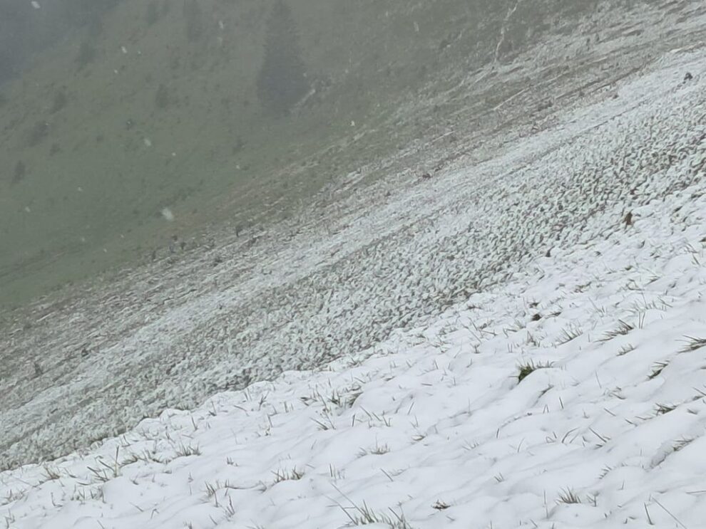 Un strat de zăpadă a acoperit Poiana cu narcise de pe Masivul Saca, aflată la 1600 de metri altitudine în Munții Rodnei, unde a nins peste covorul alb de narcise înflorite.