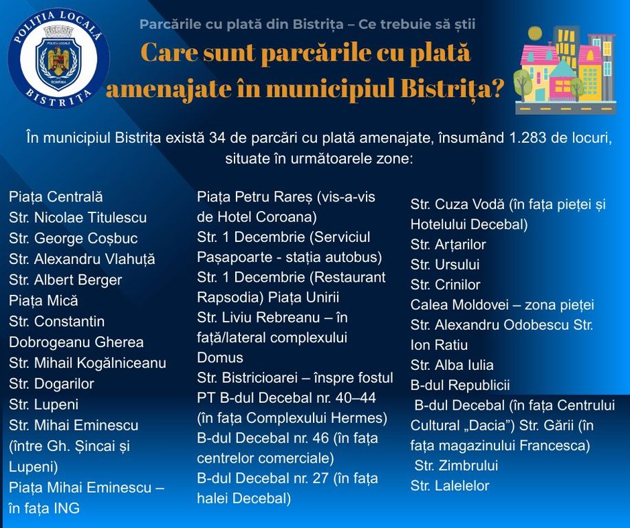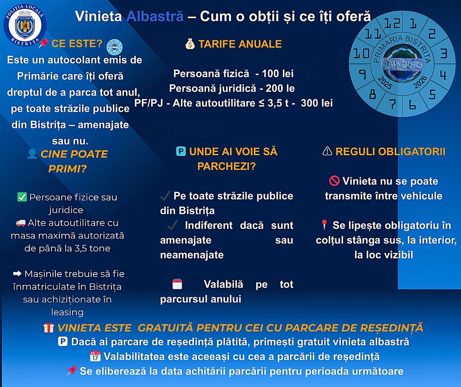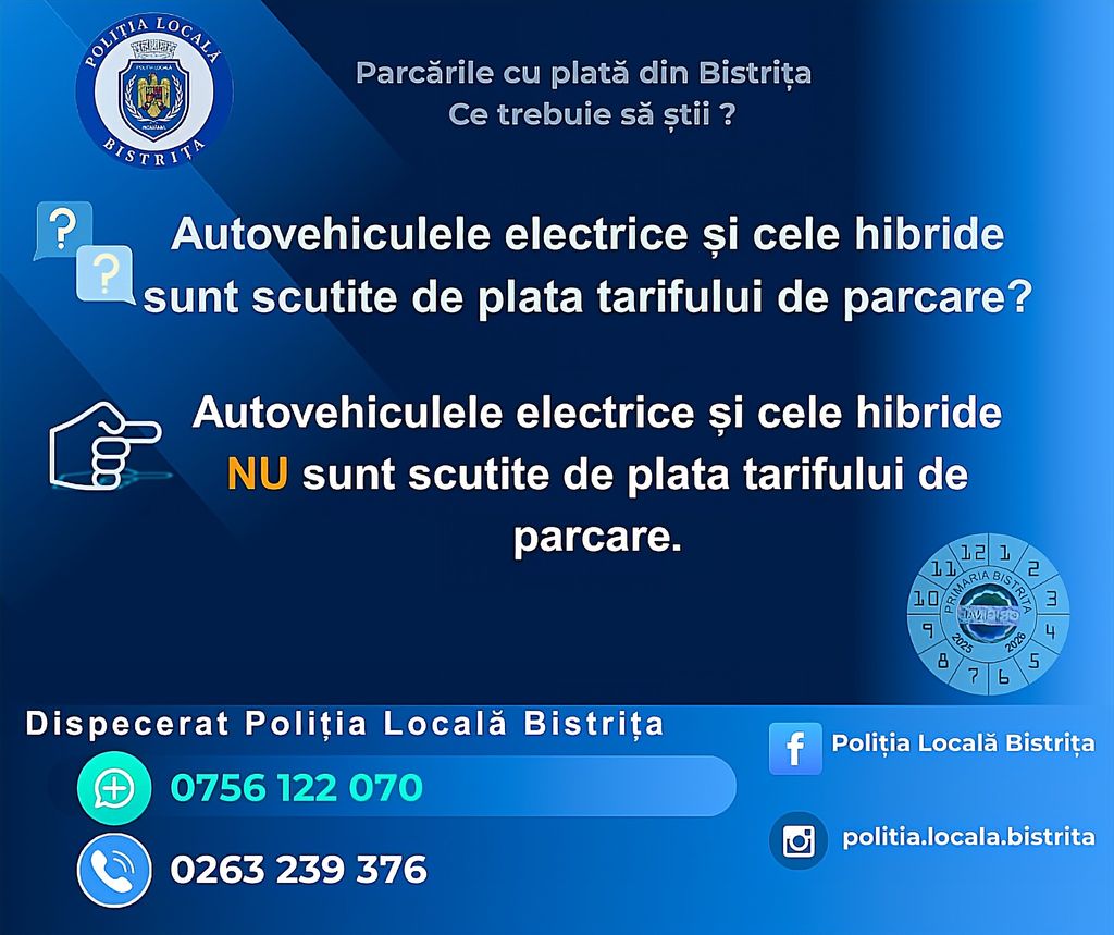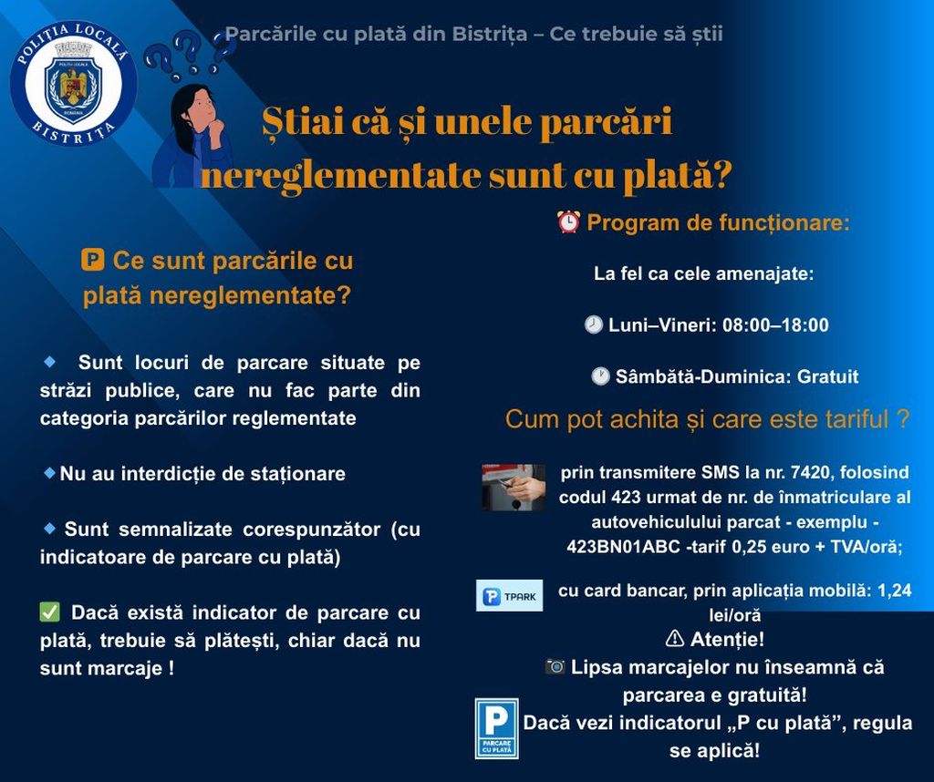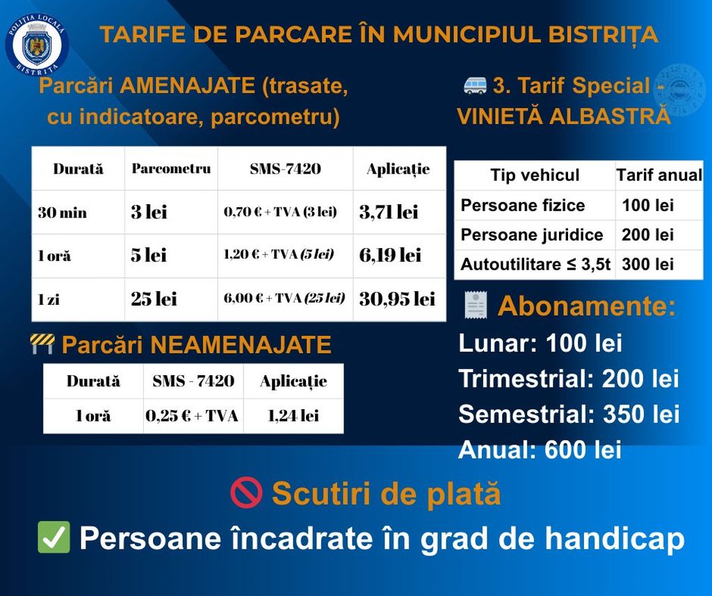 Poliția Locală Bistrița face precizări, printr-o serie de infografice explicative, cu privire la parcările din oraș, vinieta albastră, plata prin SMS (7420) sau aplicații, taxarea în weekend, excepții și facilități.
