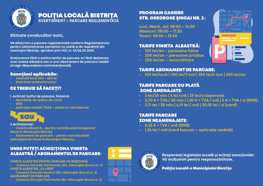 Luna aceasta, Poliția Locală Bistrița desfășoară o campanie de informare a șoferilor privind aplicarea regulamentului parcărilor cu plată și de reședință din oraș. Campania are loc pe tot parcursul lunii mai, prin distribuirea de materiale informative, fără aplicarea sancțiunilor în această perioadă. Începând cu data de 1 iunie se vor da amenzi pentru nerespectarea regulamentului.