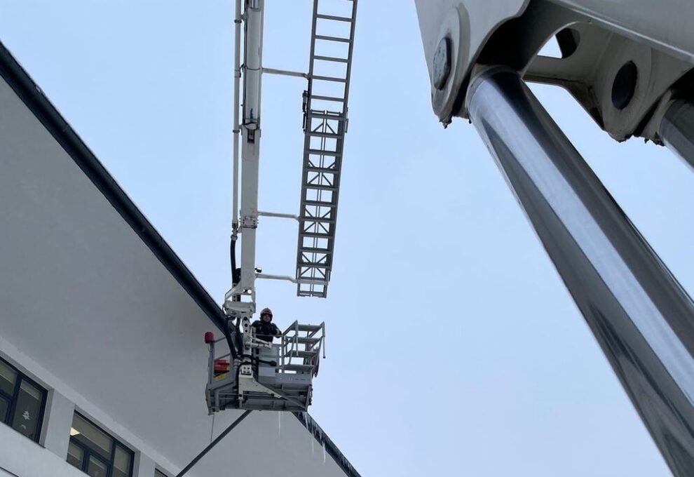 Două echipaje de pompieri cu autospeciale de lucru la înălțime, din cadrul ISU Bistrița-Năsăud, acționează pentru îndepărtarea țurțurilor formați pe clădirile unităților de învățământ din Bistrița.