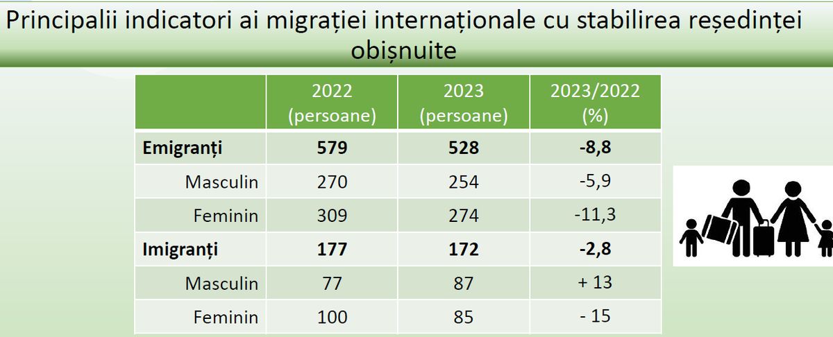 Conform anuarului statistic, anul 2022 a fost cel în care au emigrat cele mai multe persoane din județ – 579, urmează 2023 cu 528, 2021 cu 453, 2018 cu 442, 2019 cu 369 și 2020 cu 281.