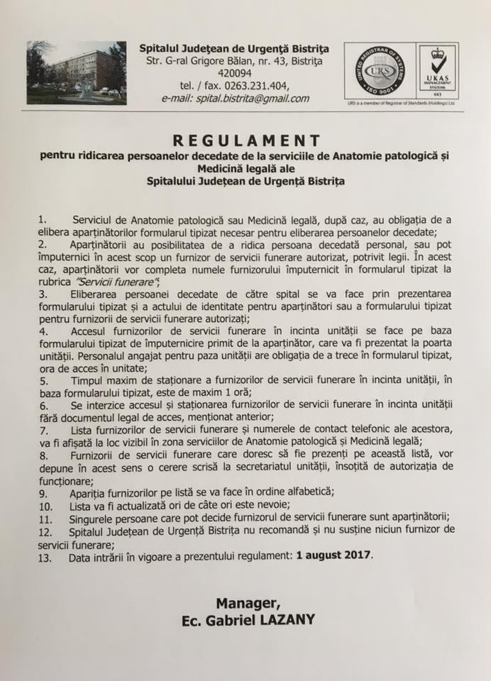 “Spitalul Judeţean de Urgenţă Bistriţa nu recomandă şi nu susţine niciun furnizor de servicii funerare”, anunţă noul manager al unităţii medicale Gabriel Lazany. Cu toate că este doar director interimar, Lazany vrea să facă ordine din acest punct de vedere.