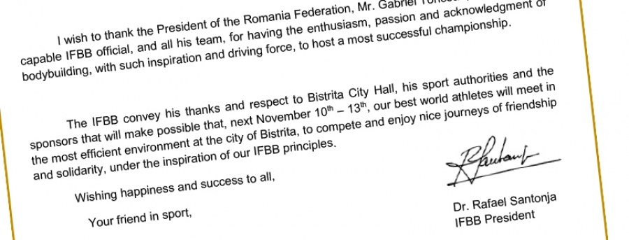 ”Bistrița și Federația pun laolaltă toate ingredientele pentru a face posibil acest CM. Îmi exprim mulțumirile și respectul pentru autoritățile din Bistrița care fac tot posibilul ca sportivii cei mai buni din lume să se întâlnească și să concureze într-un cadru foarte bun la Bistrița, în spiritul principiilor IFBB”, a transmis el.
