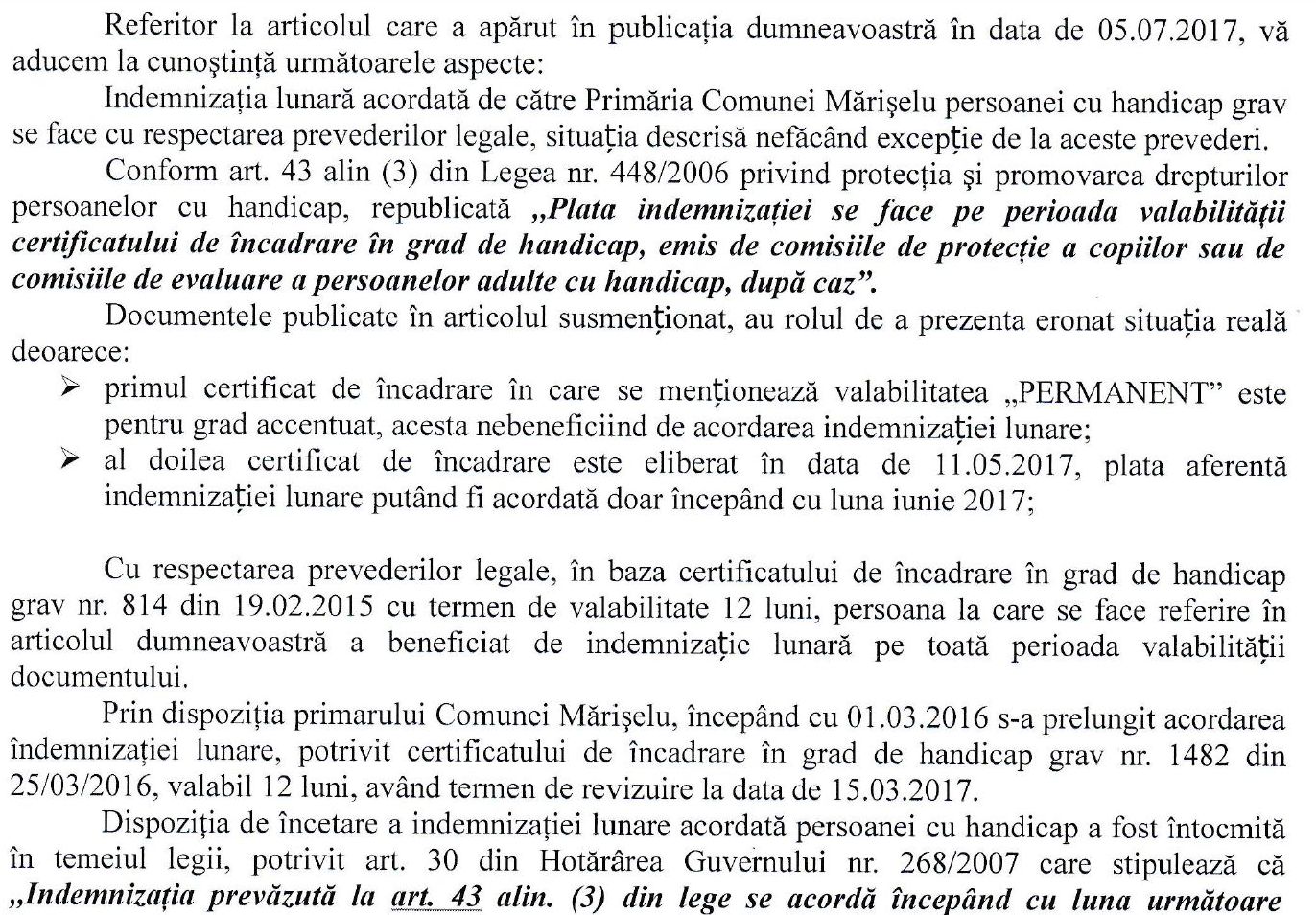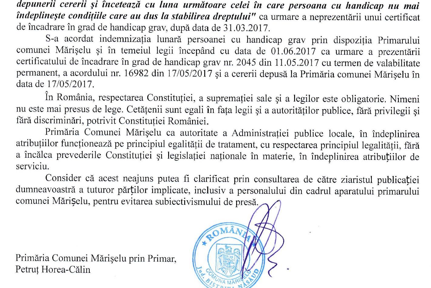2. Nu consider că există nici o legătură, între faptul că am candidat la funcția de primar al comunei Mărișelu (fapt dealtfel demult consumat), și suspendarea indemnizației mamei mele;