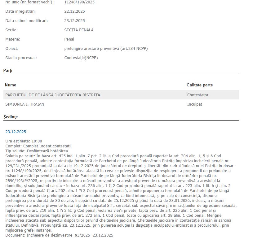 Prin soluția pronunțată la data de 23 decembrie 2025, completul de judecată a constatat că este întemeiată propunerea Parchetului privind prelungirea măsurii arestului preventiv față deTraian Simionca, respingând astfel soluția inițială de înlocuire a acestei măsuri cu arestul la domiciliu.