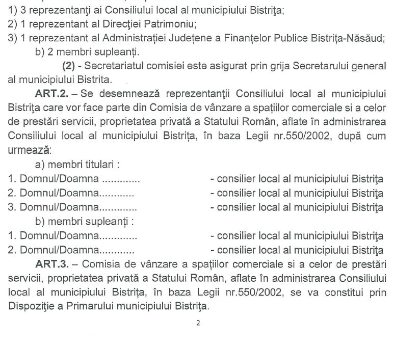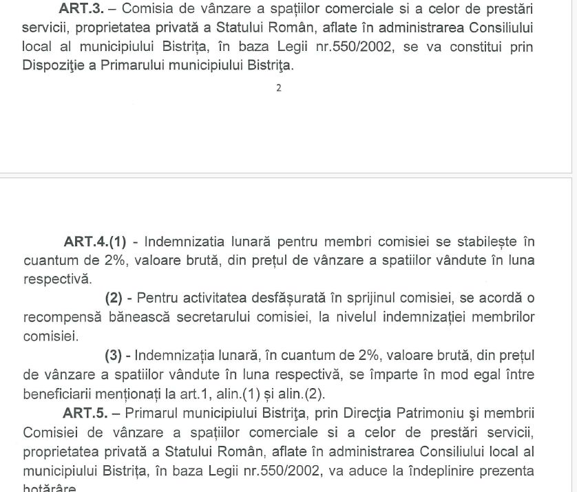 Membrii Comisiei de vânzare a spațiilor comerciale și a celor de servicii aflate în proprietatea Statului Român și în administrarea Consiliului Local Bistrița – nu vor mai primi 2% din valoarea brută de vânzare a spațiilor vândute în luna respectivă.