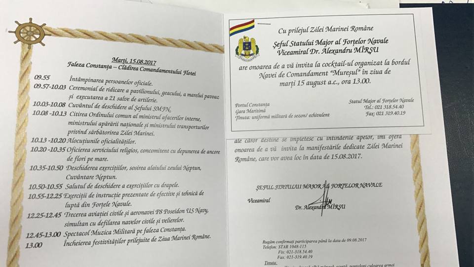 “Astăzi, 15 August 2017, am participat în calitate de invitat al domnului Amiral Dr. Alexandru Mîrşu, șeful Statului Major al Forțelor Navale, alături de domnul amiral Fl. Daniel Căpățână, cmd. flotei, Amiral Fl. Dr. Gigi Cristinel Uce, șeful Statului Major al Comandamentului Forțelor Întrunite și, nu în ultimul rând, domnul General de Brigadă Ovidiu Pop, cetățean de onoare al comunei noastre, şi alte personalităţi marcante ale politicii românești, la festivitățile prilejuite de “Ziua Marinei”!