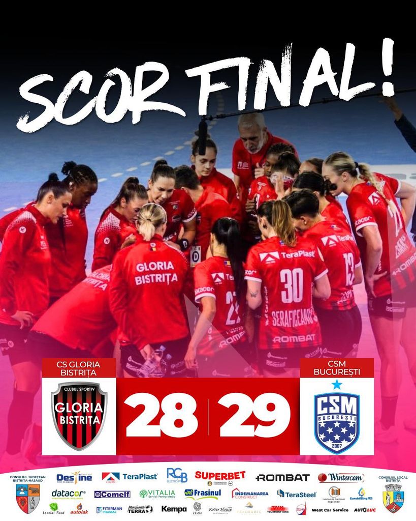 Gloria Bistrița a suferit prima înfrângere în acest sezon al Ligii Florilor la handbal feminin, pe teren propriu, în fața campioanei CSM București, într-un meci în devans din etapa a 7-a.