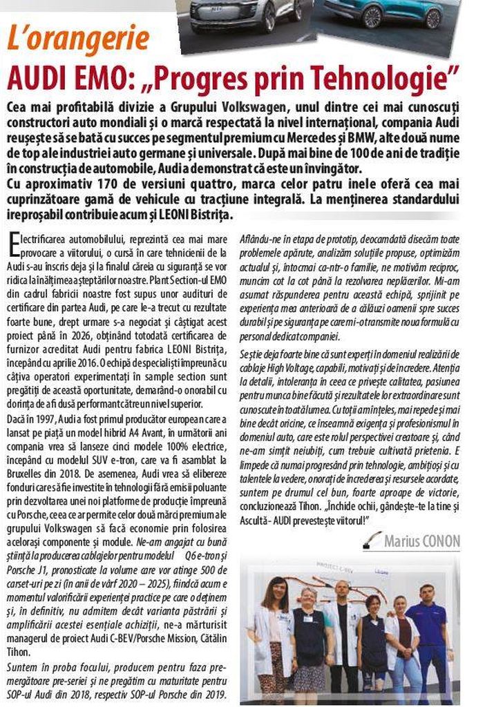 Leoni Bistrița va produce cablaje auto pentru Audi până în 2026, fabrica devenind de anul trecut furnizor autorizat pentru celebrul producător de automobile german. ”Suntem în proba focului. Producem pentru faza premergătoare pre-seriei și ne pregătim cu maturitate pentru SOP-ul Audi din 2018 și SOP-ul Porsche din 2019”, spune managerul de proiect Audi C-BEV/Porsche Mission, Cătălin Tihon.