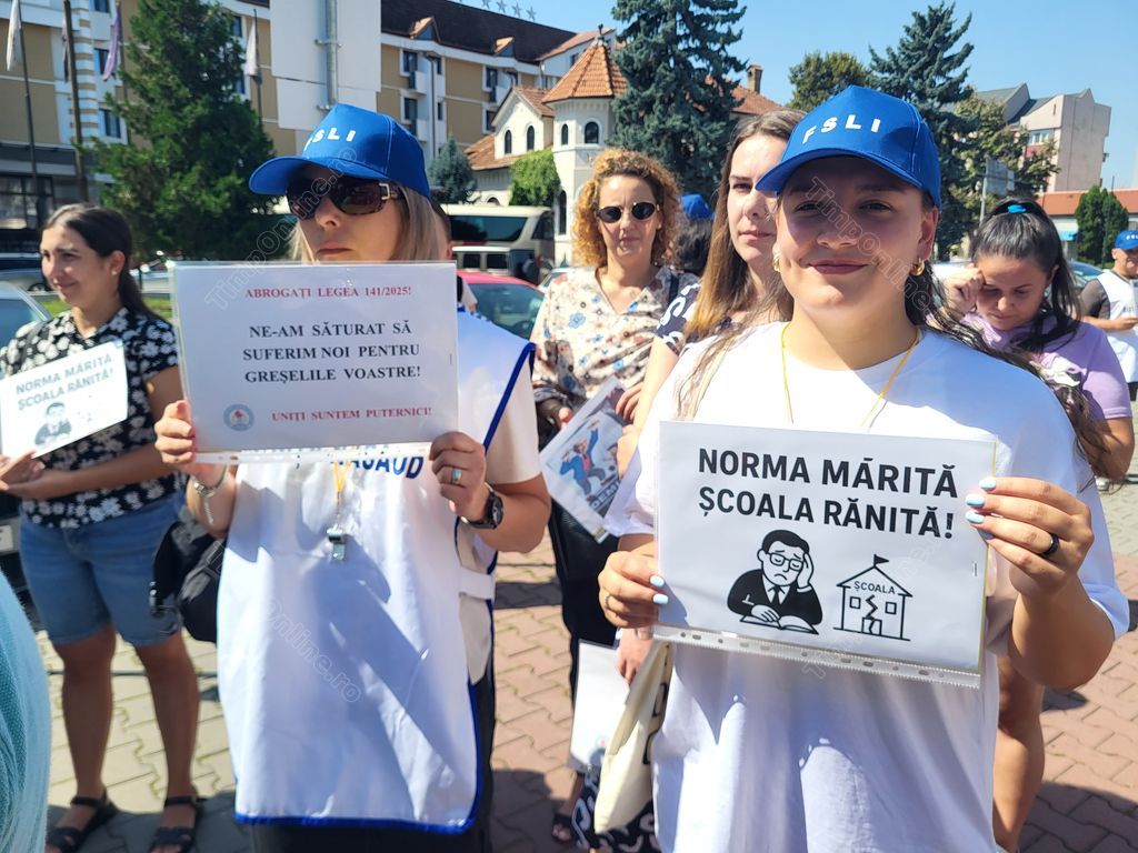 ”Am ieșit în stradă din cauza prevederilor Legii 141 referitoare la educație. Suntem nemulțumiți de creșterea normei didactice de la 18 la 20 de ore, însă domnul ministru David nu a spus niciodată că profesorilor cu vechime peste 25 de ani și gradul I le crește norma cu 4 ore. În vechea lege aveau dreptul la 16 ore. Apoi, mai suntem nemulțumiți de comasarea școlilor, reducerea cuantumului la ore plus catedră și creșterea normei de predare pentru directori și inspectori, ceea ce a dus la dispariția în județul nostru a 270 de catedre, ceea ce îi afectează pe suplinitorii calificați care nu mai intră în calcul”, a spus Victor Ivan, liderul județean al UJSLI Bistrița-Năsăud.
