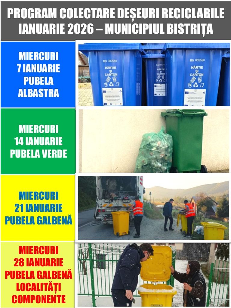 Iată programul de colectare a deșeurilor reciclabile în luna ianuarie 2026 pentru municipiul Bistrița și localitățile componente.