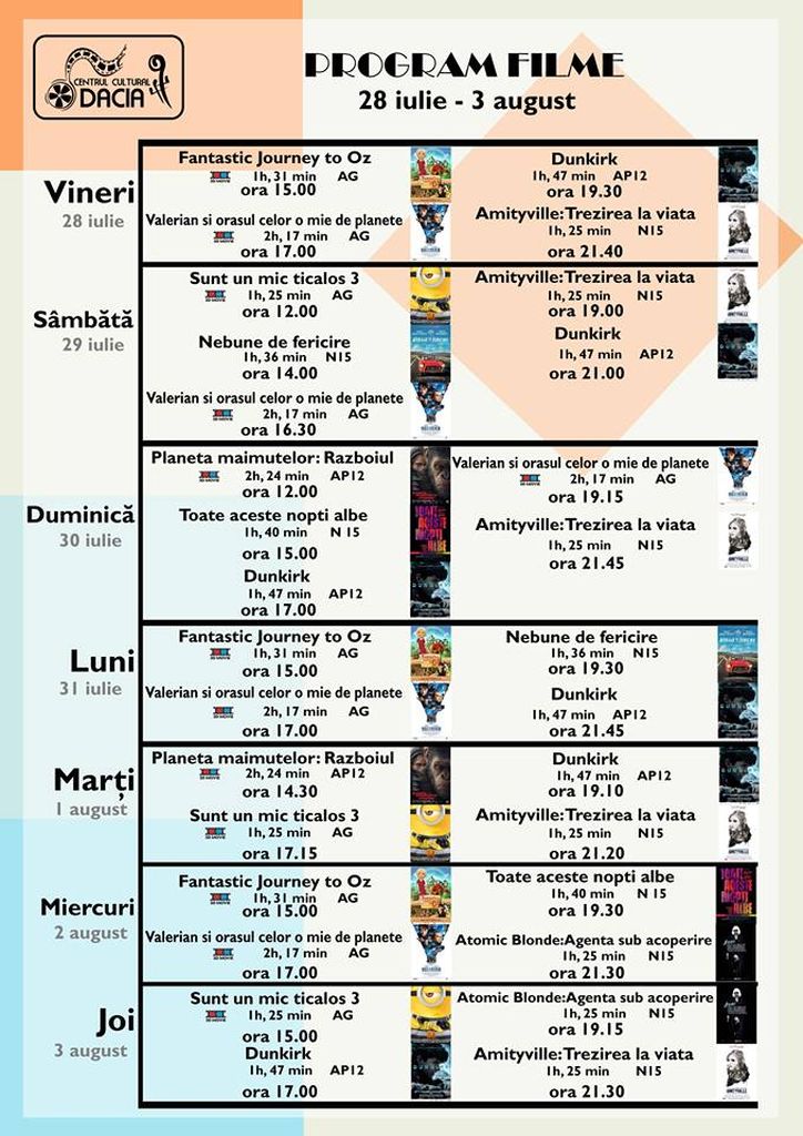 (TRAILERE) Iată ce filme puteți urmări în Sala de cinema ”Adrian Pintea” a Centrului Cultural Dacia de pe Bd. Decebal din Bistrița în perioada 28 iulie – 3 august: Fantastica aventură din Oz, Valerian și orașul celor o mie de planete, Dunkirk, Amytiville: Trezirea la viață, Sunt un mic ticălos 3, Nebune de fericire, Planeta maimuțelor: Războiul, Toate aceste nopți albe, Atomic Blonde: Agenta sub acoperire.