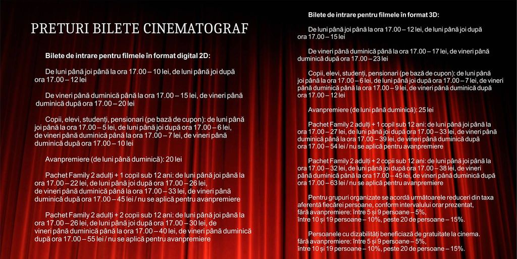 Achiziţia biletelor se poate face direct de la Casa de bilete a Centrului Cultural Dacia: luni – duminică între orele 9.00 – 22.00. La filmele 3D, ochelarii se cumpără odată cu biletul și costă 4 lei (sunt mărimi diferite pentru adulți și copii). Puteți păstra ochelarii și astfel îi aveți pentru filmele următoare, fără a fi nevoie să îi achiziționați de fiecare dată.