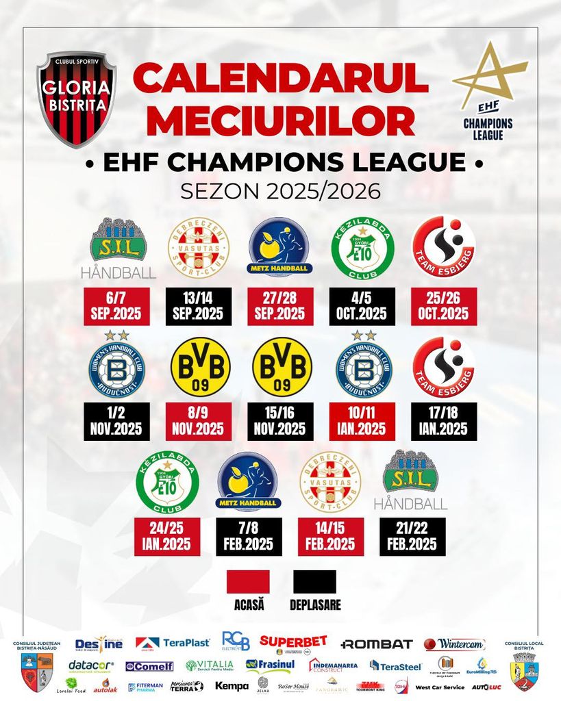 Gloria Bistrița va juca în Grupa A alături de Storhamar Handball Elite (Norvegia), Metz Handball (Franța), Gyor Audi ETO KC (Ungaria), Borussia Dortmund (Germania), Team Esbjerg (Danemarca), OTP Group Buducnost Podgorica (Muntenegru), Debrecen VSC Schaeffler (Ungaria).