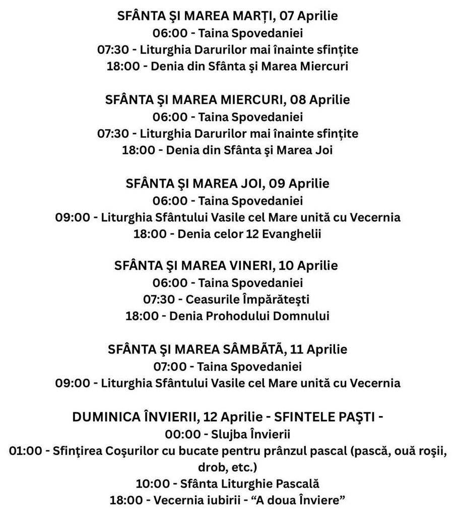 Programul slujbelor în aceste zile din Săptămâna Patimilor și de Înviere, la Biserica Protopopiatului Ortodox din Bistrița, de la Coroana, este următorul: