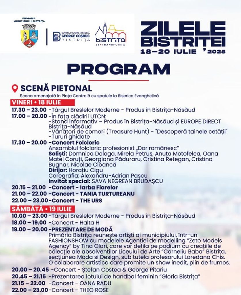 Zilele Bistriței 2025 se desfășoară în perioada 18-20 iulie. Municipalitatea anunță că a pregătit un program bogat, pentru toate gusturile și toate vârstele, care aduce orașul la viață din zori și până târziu în noapte, pentru prima dată fiind implicate și instituțiile culturale județene, dar și comunitatea locală.