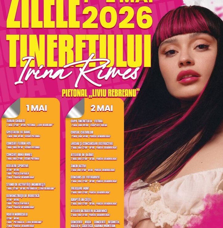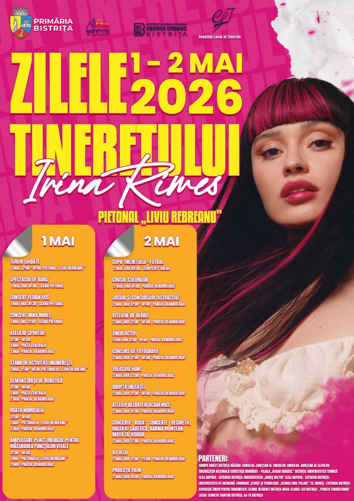 ”1-2 mai. Două zile în care orașul aparține tinerilor. De Zilele Tineretului 2026, aducem tinerii Bistriței împreună printr-un program care îmbină sportul, cultura și inițiativa tinerilor – pe Pietonalul Liviu Rebreanu, în Parcul Dendrologic și la TeraPlast Arena. Avem de toate: competiții sportive, ateliere, jocuri și concursuri, tururi ghidate, demonstrații de robotică, crosul culorilor, activități pentru comunitate și, seara, concerte care adună generații. Pe scenă: Florin Vos și Irina Rimes, alături de artiști locali și trupe tinere care dau tonul noii generații. Este felul nostru de a spune că Bistrița nu doar crește, ci își creează viitorul împreună cu cei care îl vor duce mai departe”, spune primarul Gabriel Lazany.