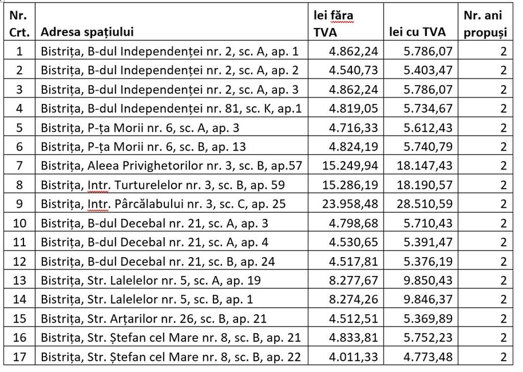 Sumele sunt stabilite ȋn baza fişelor de calcul fundamentate de către Direcţia Tehnică din cadrul Primăriei Bistriţa pentru fiecare apartament, raportat la suprafaţa acestora şi la valoarea lucrărilor executate în concret pentru fiecare apartament, şi comunicate Direcţiei Economice în vederea instituirii acesteia ȋn sarcina proprietarilor.