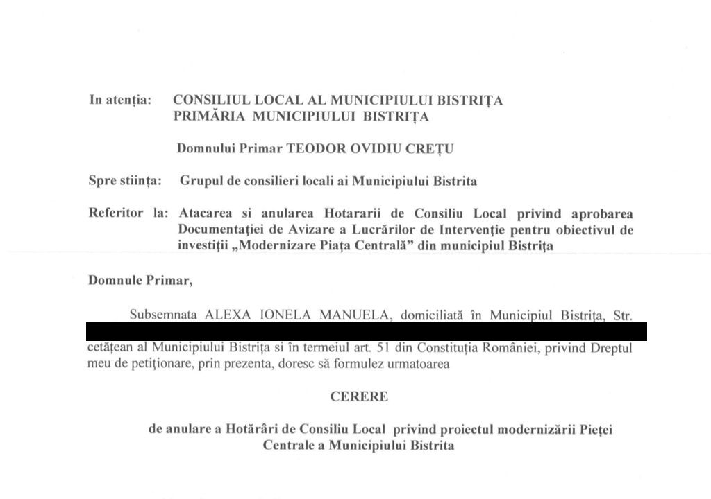Proiectul de modernizare a Pieţei Centrale, aprobat în şedinţa Consiliului Local Bistriţa, stârneşte deja primele reacţii. Ionela Alexa, “cetăţean al municipiului Bistriţa”, a transmis, în nume personal, primarului Ovidiu Creţu şi Consiliului Local Bistriţa, următoarea cerere pe care o redăm integral: