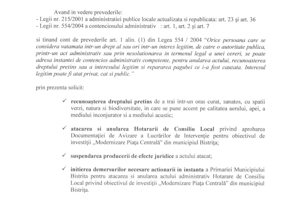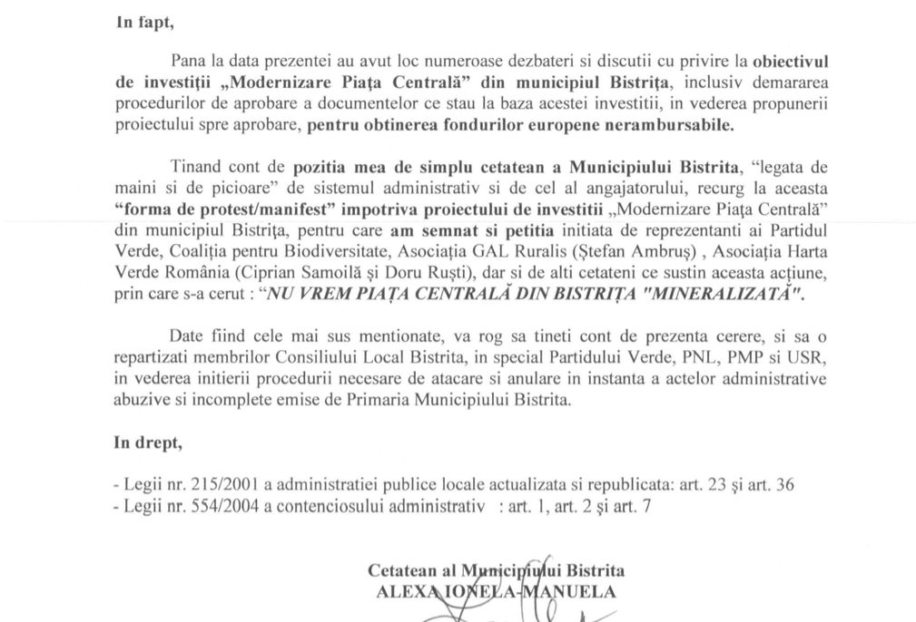 Felicitari bistritencei noastre ! Om de mare calitate care a inteles foarte bine rolul mediului inconjurator in viata noastra. Stimata doamna nu o sa fiti singura in demersul d-vs. Se vor alatura si VERZII si multi altii. Impreuna vom reusi sa demonstram si sa aratam in instanta cate legi incalca onorabila primarie. In toata EUROPA nici un alt stat, primarie, administratie nu si-ar permite o asemenea abordare cu incalcari de sapte (7) legi, din care cinci(5) de MEDIU.