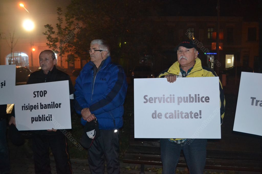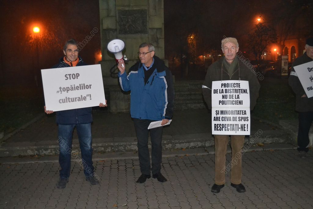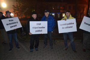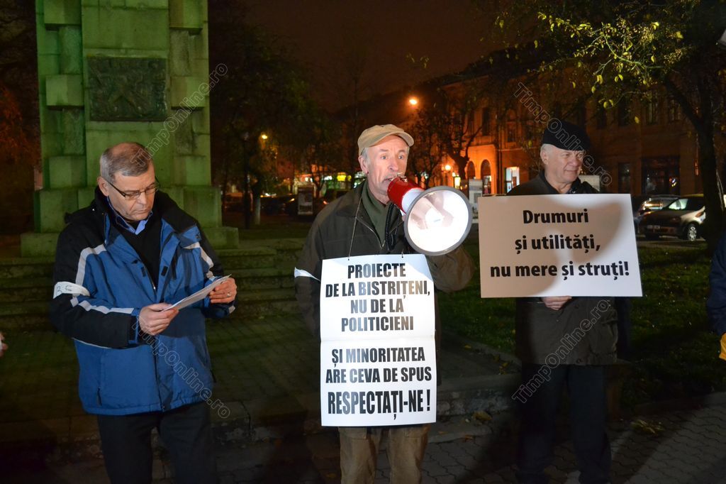 Bistriţenii nemulţumiţi de felul în care sunt cheltuiţi banii publici ai oraşului au protestat joi seara în faţa statuii lui Andrei Mureşanu din Piaţa Centrală. Protestul a fost precedat de ascultarea Imnului Naţional şi a cântecului “România, trezeşte-te!”. Cei mai mulţi dintre participanţi, protestatari cunoscuţi de la alte evenimente similare, au purtat pancarte pe care au scris nemulţumirile şi solicitările lor.