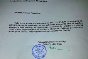 La adresa din 23 ianuarie, primarul Ovidiu Crețu a răspuns că ”potrivit informațiilor prezentate, nu sunt suficiente argumente care să justifice acordarea acestei distincții, în conformitate cu prevederile Hotărârii Consiliului Local privind Regulamentul de acordare a titlului de Cetățean de onoare al municipiului Bistrița precum și ale Statutului municipiului Bistrița”.