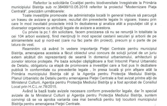La începutul acestei luni, Coaliția pentru Biodiversitate și Partidul Verde au depus la Primăria Bistrița, în atenția primarului și a Consiliului Local, petiția ”Nu vrem Piața Centrală din Bistrița ”mineralizată” și o listă de 1.370 de semnături, prin care solicită ”renunțarea la eliminarea perimetrelor înierbate, a rondourilor pentru flori și tăierea aproape în totalitate a celor 104 arbori existenți, din care 64 de aliniament în cadrul proiectului „Modernizare Piața Centrală”, restrângerea la maxim a suprafeței de teren care se dorește „mineralizată” – maxim 20% din cele 2 hectare cât reprezintă Piața Centrală, oganizarea mai multor sesiuni de dezbatere publică și consultare a specialiștilor din cadrul ONG-urilor de profil înainte de stabilirea propunerii finale de proiectare”, precum și să nu aprobe în CL documentațiile tehnico-economice aferente proiectului în această formă.