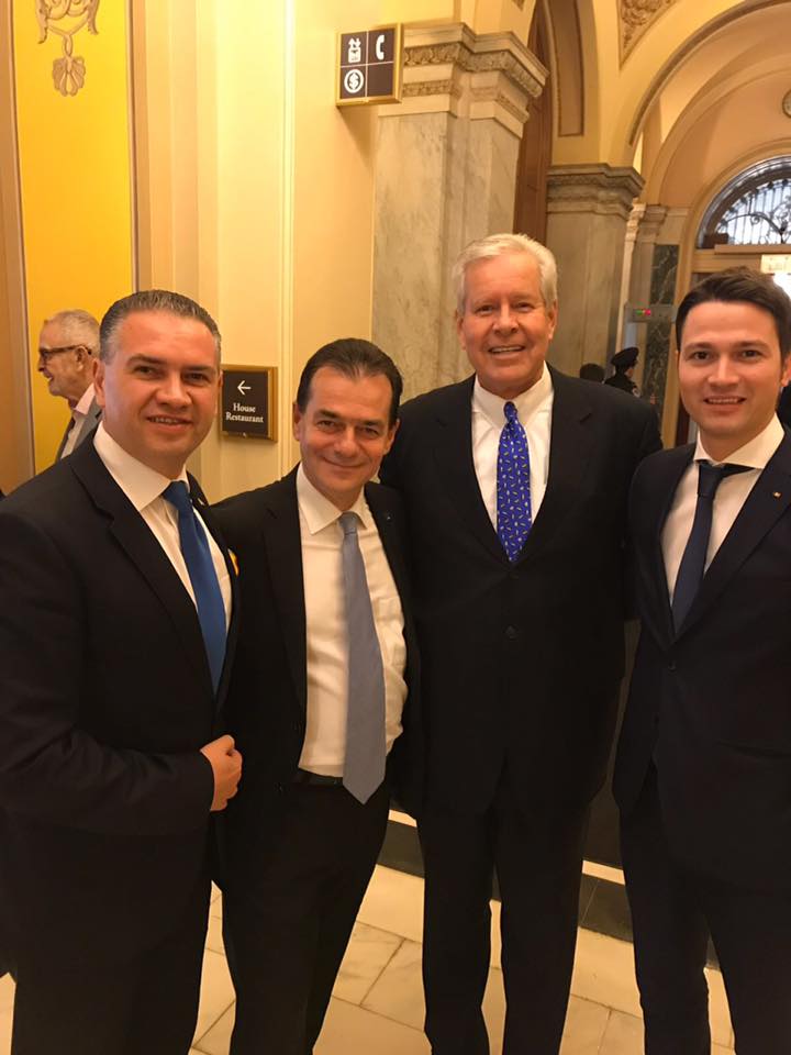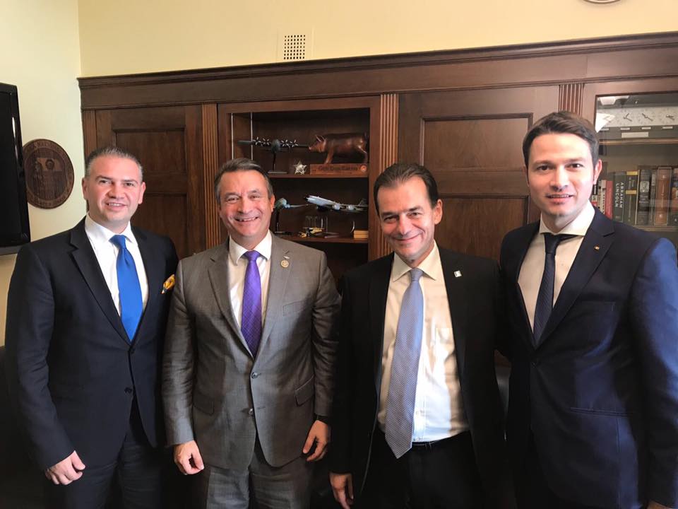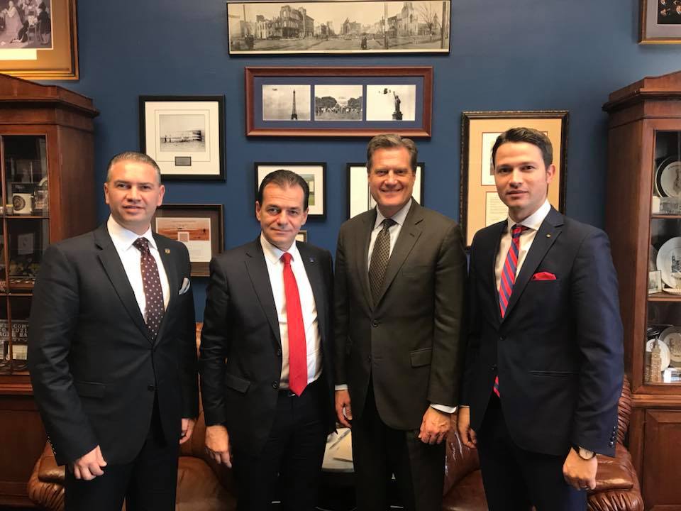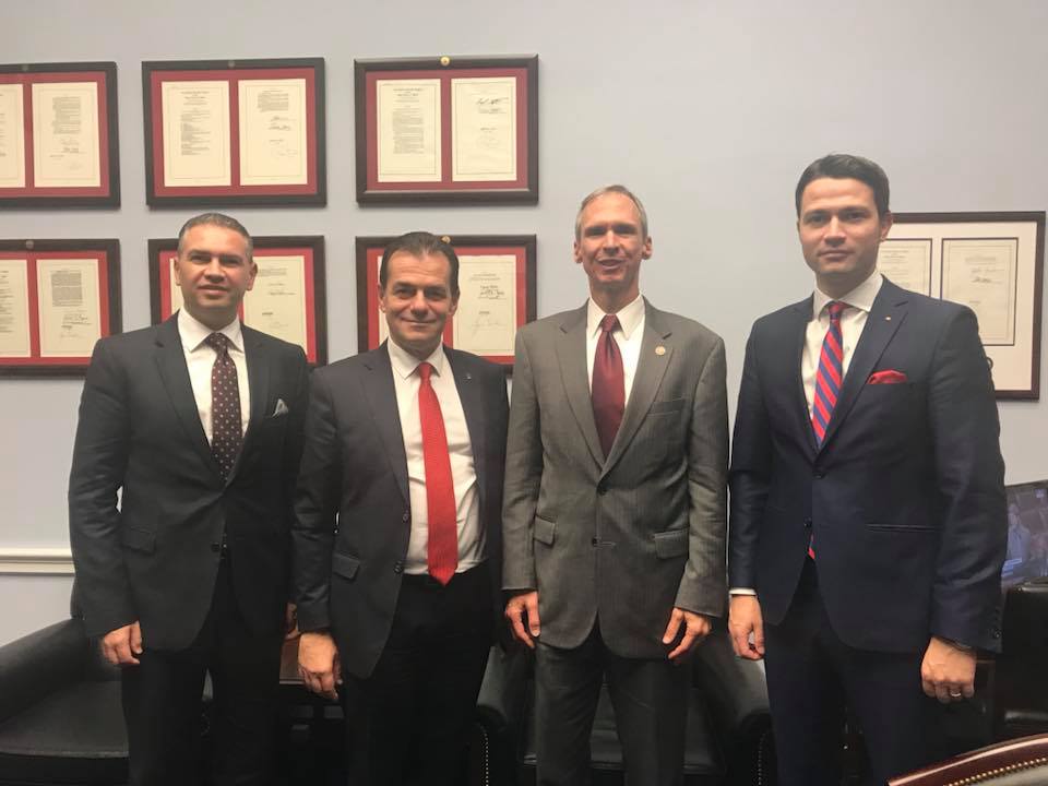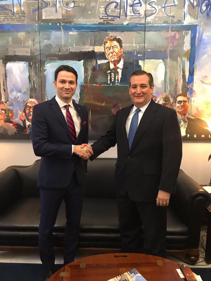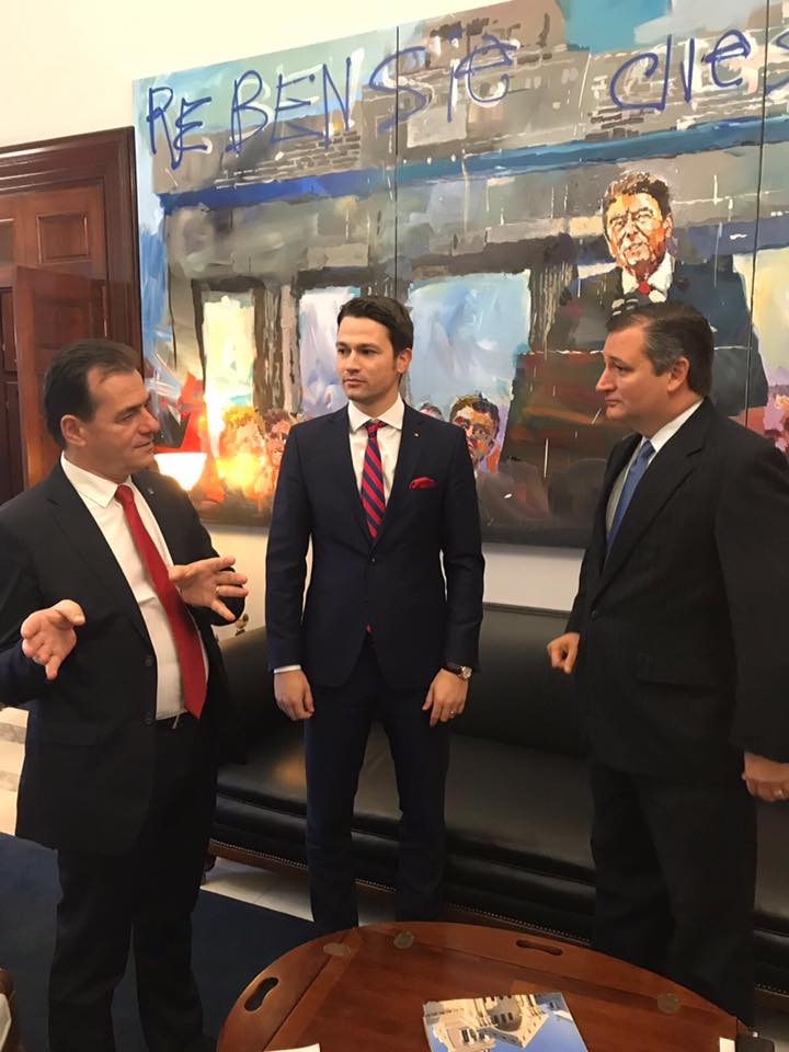 ”Washington DC – Întâlnire cu Ted Cruz. Senatorul Ted Cruz, fost candidat la președinția SUA, este unul dintre cei mai influenți lideri republicani. A fost o deosebită plăcere de a prezenta situația politică din regiune și de a discuta despre dezvoltarea parteneriatului strategic pe dimensiunea economică. A răspuns favorabil invitației noastre, de a efectua o vizită în România, într-un viitor apropiat. Am fost impresionați de tabloul imens din biroul său senatorial, reprezentând discursul lui Ronald Reagan în fața zidului Berlinului, simbolul prăbușirii regimurilor totalitare din Europa de Est”.
