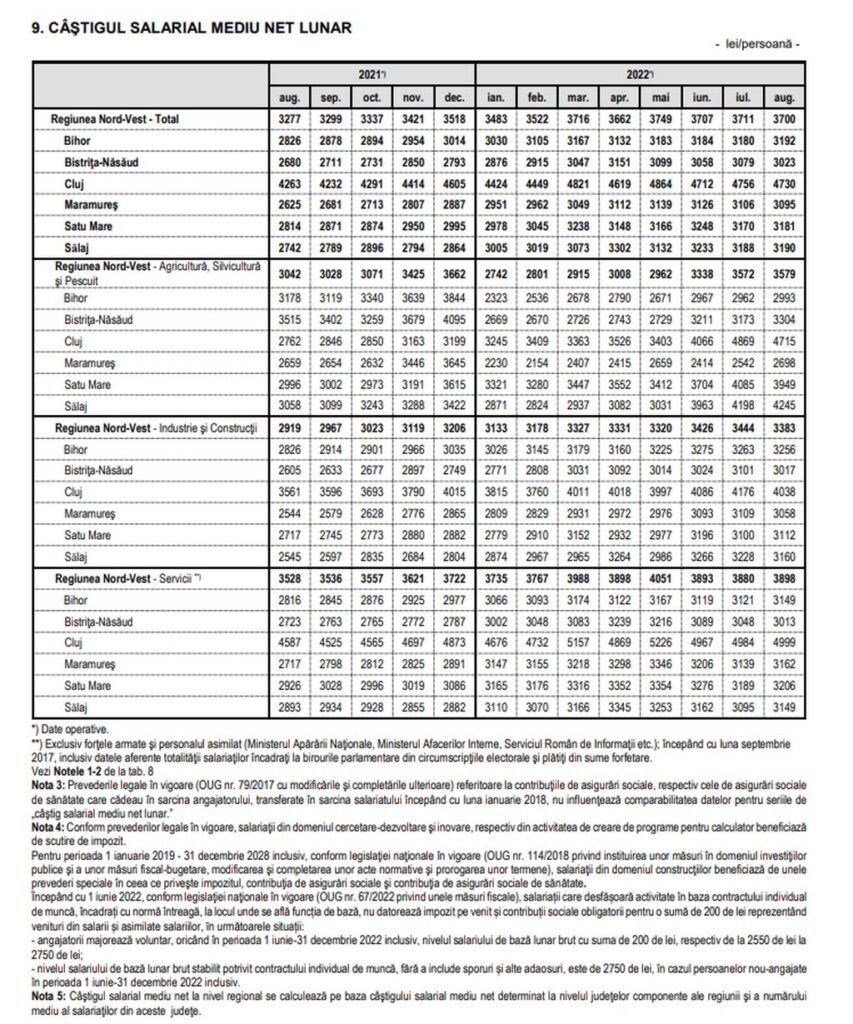 Angajații din Bistrița-Năsăud câștigă, în continuare, cei mai puțini bani din regiunea de nord-vest, salariul mediu net lunar fiind, în luna august de 3023 de lei, sub cele din Maramureș (3095 de lei), Satu Mare (3181 lei), Sălaj (3190 lei), Bihor (3192 lei) și mult sub cel din județul Cluj (4730 de lei), arată datele publicate de Direcția Regională de Statistică Bistrița-Năsăud.
