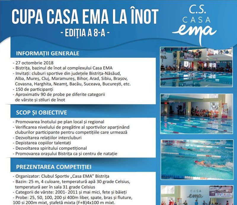 Clubul Sportiv ”Casa EMA” organizează sâmbătă 27 octombrie, pentru al 8-lea an consecutiv, Cupa Casa EMA la înot, cea mai prestigioasă competiție de natație din județ. 114 sportivi de la 8 cluburi din țară se întrec pentru medalii și cupe în bazinul de la Casa EMA.