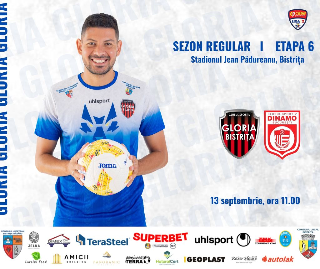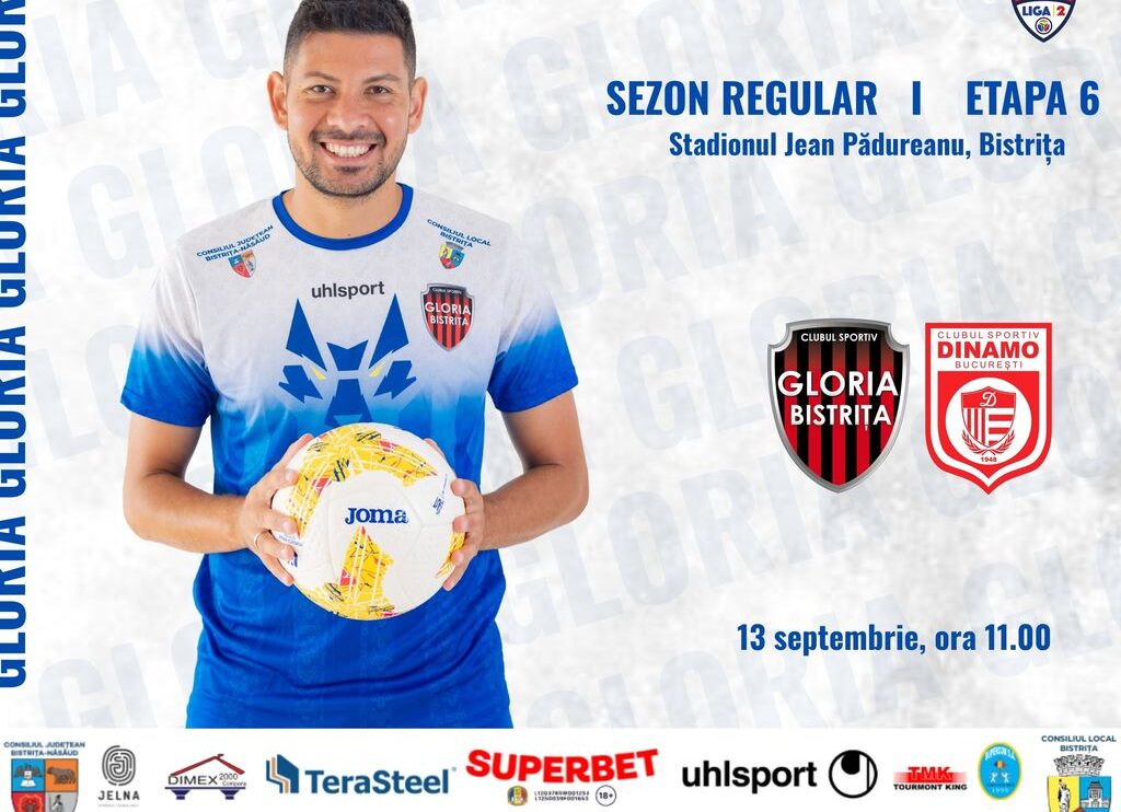 Gloria Bistrița joacă sâmbătă 13 septembrie în etapa a 6-a a Ligii 2 la fotbal, pe teren propriu, cu CS Dinamo București. Partida se va disputa pe Stadionul ”Jean Pădureanu” începând cu ora 11.00.