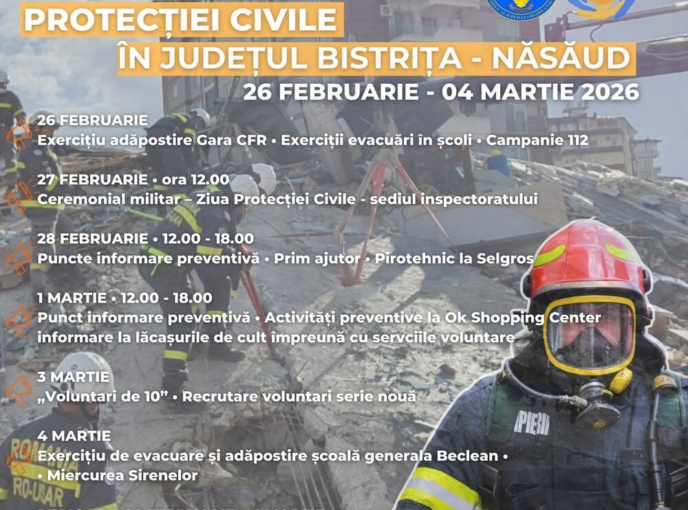 În contextul marcării Săptămânii Protecției Civile, în perioada 26 februarie – 4 martie, ISU Bistrița-Năsăud organizează, la nivelul întregului județ, o serie amplă de activități dedicate informării preventive, pregătirii populației și consolidării relației dintre salvatori și comunitate.