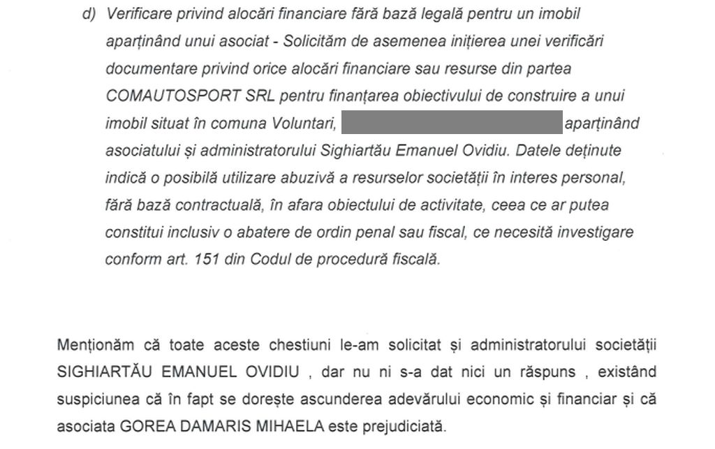 Nu în ultimul rând, ea cere Administrației Județene a Finanțelor Publice să verifice alocările financiare ”fără bază legală” pentru imobilul în care locuiește Robert Sighiartău, casă care ar fi fost construită tot cu bani plătiți de Comautosport.