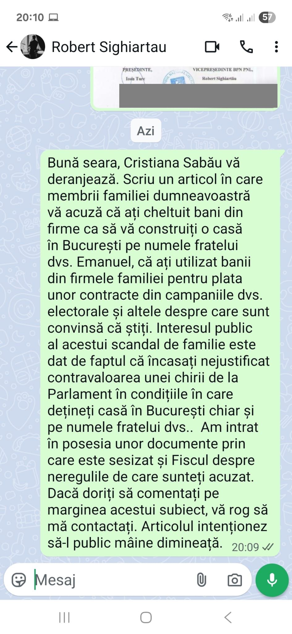 Vineri seara la ora 20.09, Timp Online i-a trimis un mesaj deputatului Robert Sighiartău: ”Scriu un articol în care membrii familiei dumneavoastră vă acuză că ați cheltuit bani din firme ca să vă construiți o casă în București pe numele fratelui dvs. Emanuel, că ați utilizat banii din firmele familiei pentru plata unor contracte din campaniile dvs. electorale și altele despre care sunt convinsă că știți. Interesul public al acestui scandal de familie este dat de faptul că încasați nejustificat contravaloarea unei chirii de la Parlament în condițiile în care dețineți casă în București chiar și pe numele fratelui dvs.. Am intrat în posesia unor documente prin care este sesizat și Fiscul despre neregulile de care sunteți acuzat. Dacă doriți să comentați pe marginea acestui subiect, vă rog să mă contactați. Articolul intenționez să-l public mâine dimineață”.