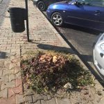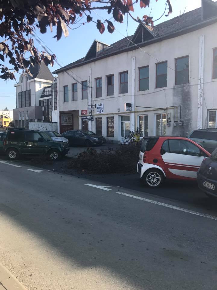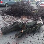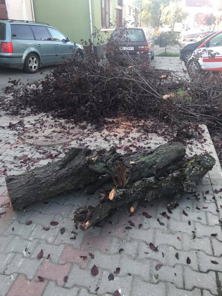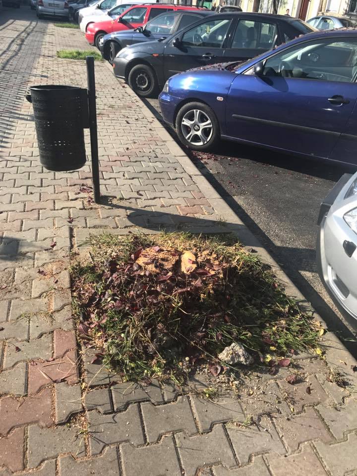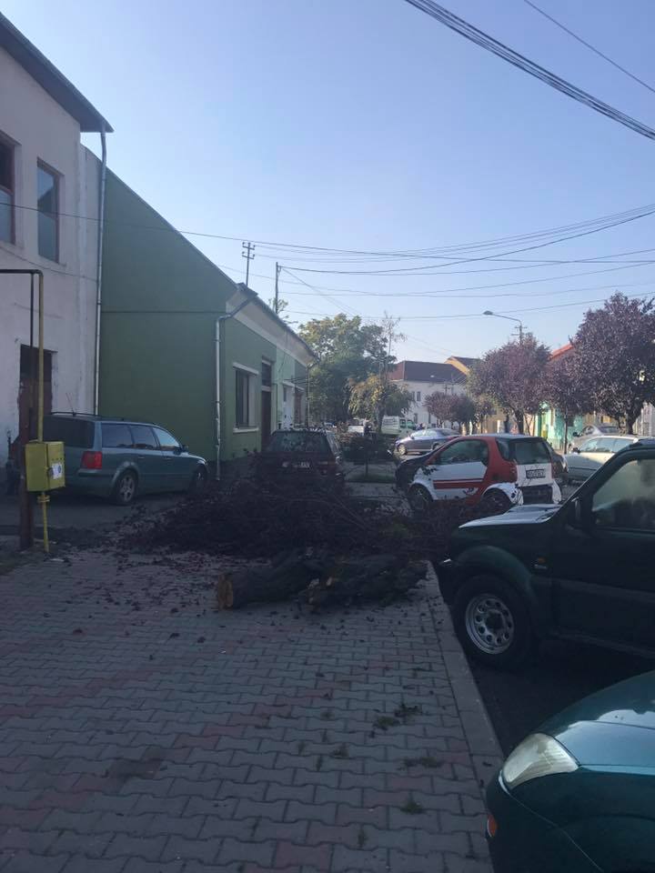 Așa, ne trezim că unii colegi ce au fost mai harnici și au ajuns la serviciu înaintea Poliției Locale au mașinile parcate regulamentar în parcarea izolată cu jaloane. În plus, lumea trece pe trotuar, în timp ce cade… COPACUL, fără nicio protecție!