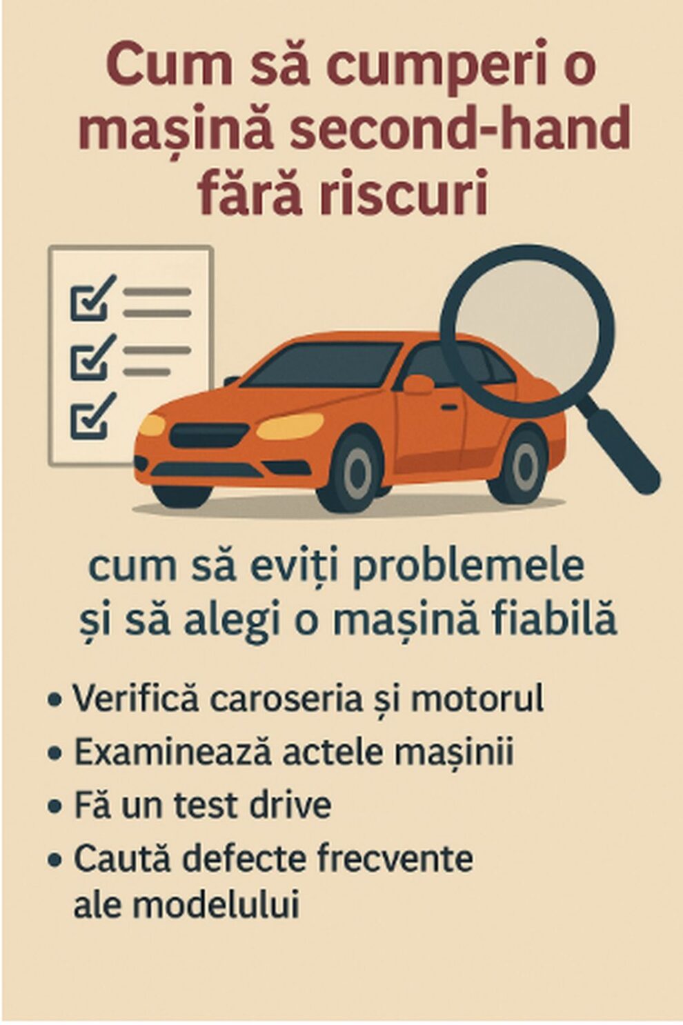 Ghidul vizual prezintă pașii esențiali pentru cumpărarea în siguranță a unei mașini second-hand: verificarea caroseriei și motorului, examinarea actelor, efectuarea unui test drive și identificarea defectelor frecvente specifice modelului ales.
