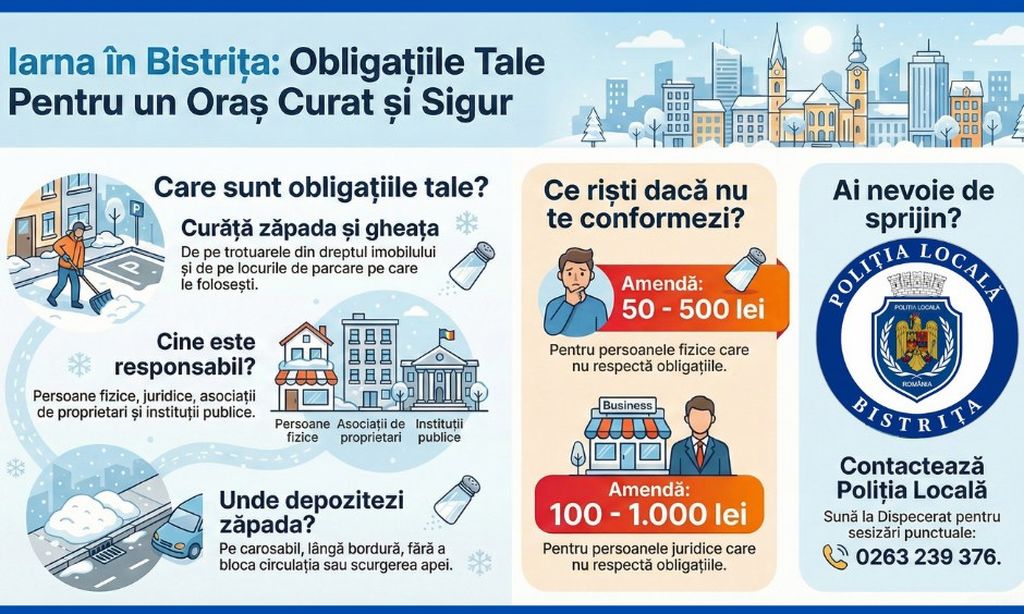 Polițiștii locali s-au deplasat la sediile agenților economici din Bistrița pentru a-i informa despre responsabilitățile care le revin în sezonul rece. ”Nu am mers pentru a aplica sancțiuni, ci pentru a ne asigura că fiecare antreprenor cunoaște obligațiile legale privind curățarea trotuarelor din dreptul spațiilor comerciale”, a precizat Poliția Locală Bistrița.