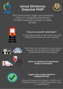 ”Am conştiinţa împăcată că în Parlament fac ce trebuie. Am promovat o lege care salvează vieţi prin instalarea de bariere la toate trecerile la nivel cu calea ferată”, a spus președintele PMP Bistrița-Năsăud, deputatul Ionuț Simionca, după aprobarea de către Camera Deputaților, în calitate de cameră decizională, a proiectului său de lege prin care propune instalarea de bariere sau semibariere la toate trecerile la nivel cu calea ferată ale drumurilor internaționale sau naționale, reducând astfel riscul de producere a accidentelor rutiere.