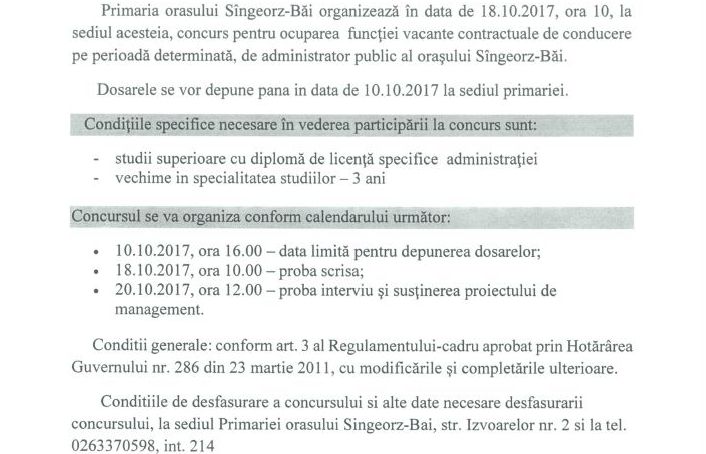 În plin scandal privind organizarea unui referendum pentru demiterea primarului, Primăria Sîngeorz-Băi organizează concurs pentru funcția de administrator public al orașului.