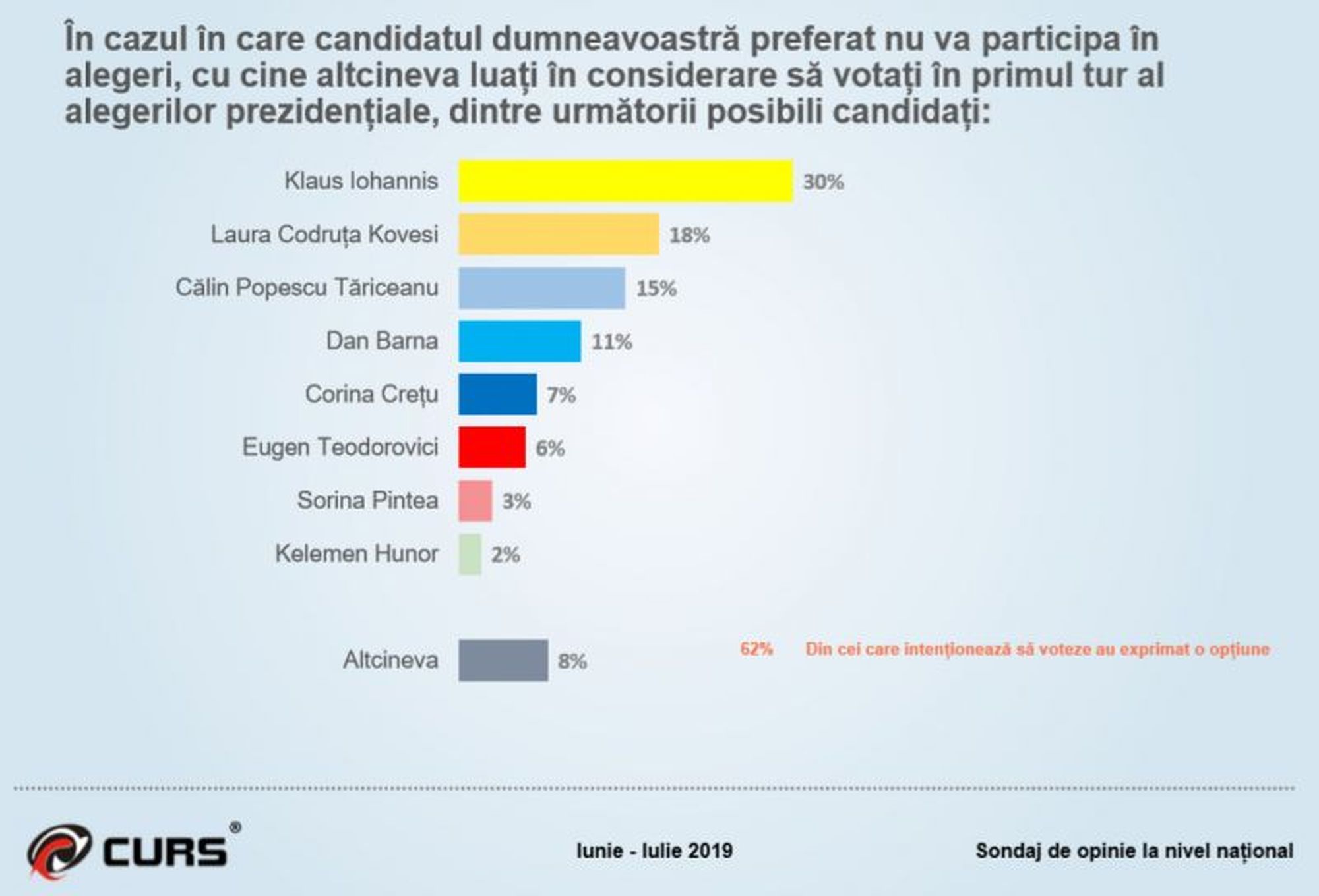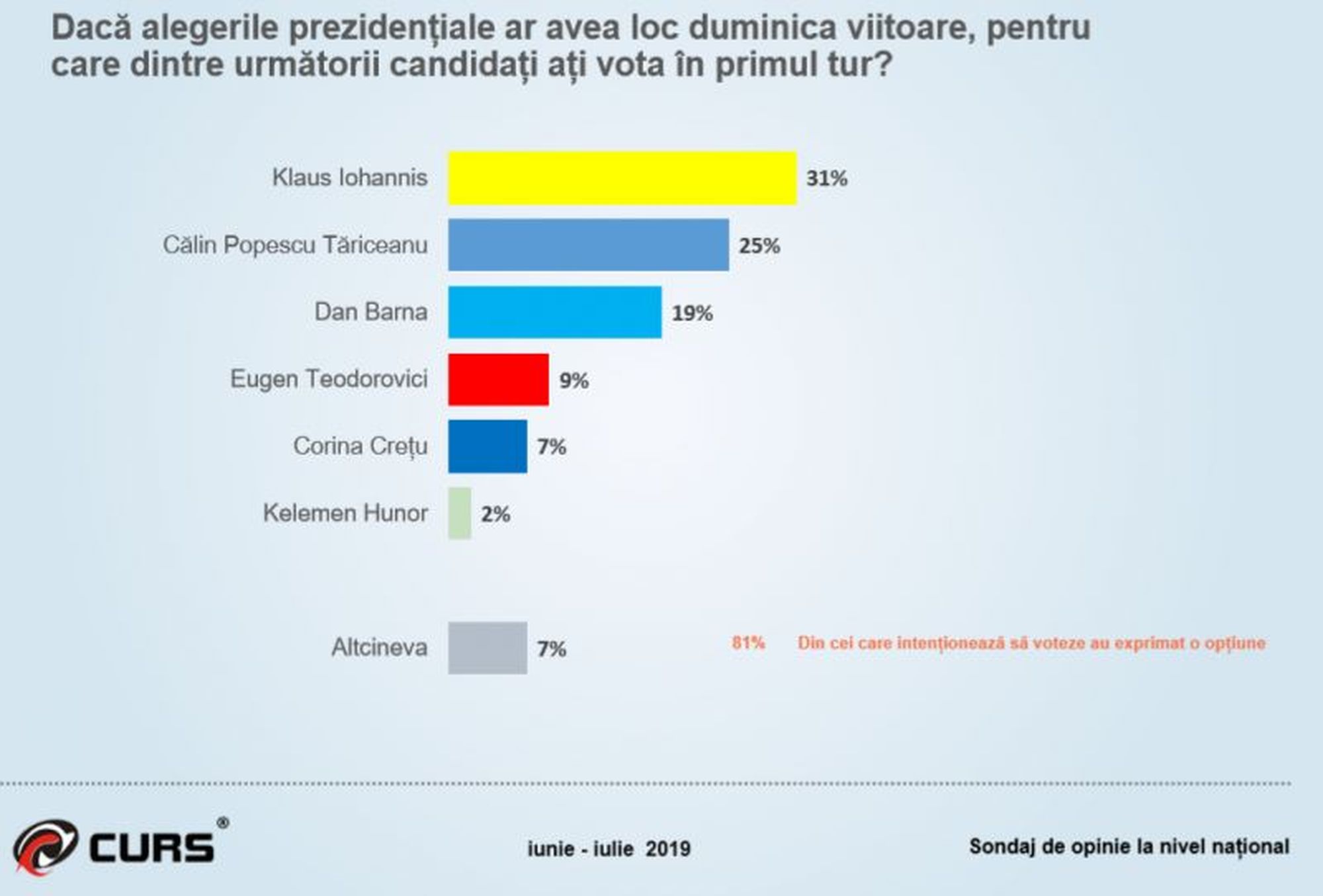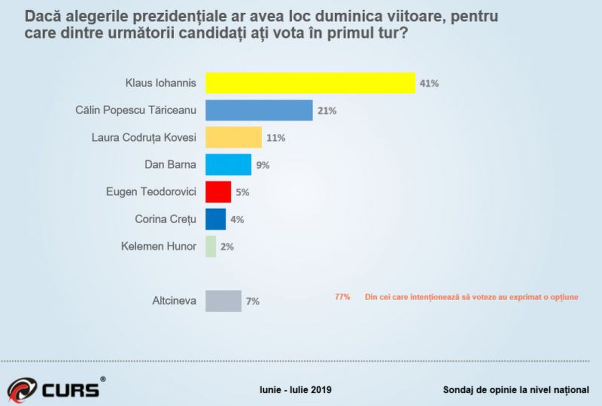 Centrul de Sociologie Urbană și Regională (CURS) a realizat un sondaj având ca temă alegerile prezidențiale care se vor desfășura în 10 noiembrie (primul tur de scrutin) și 24 noiembrie (turul doi de scrutin). Sondajul de tip Omnibus a fost realizat în perioada 28 iunie – 8 iulie pe un eșantion de 1067 respondenți la domiciliul acestora. Datele sunt ponderate, iar marja de eroare este de plus/minus 3 la sută, scrie stiripesurse.ro.