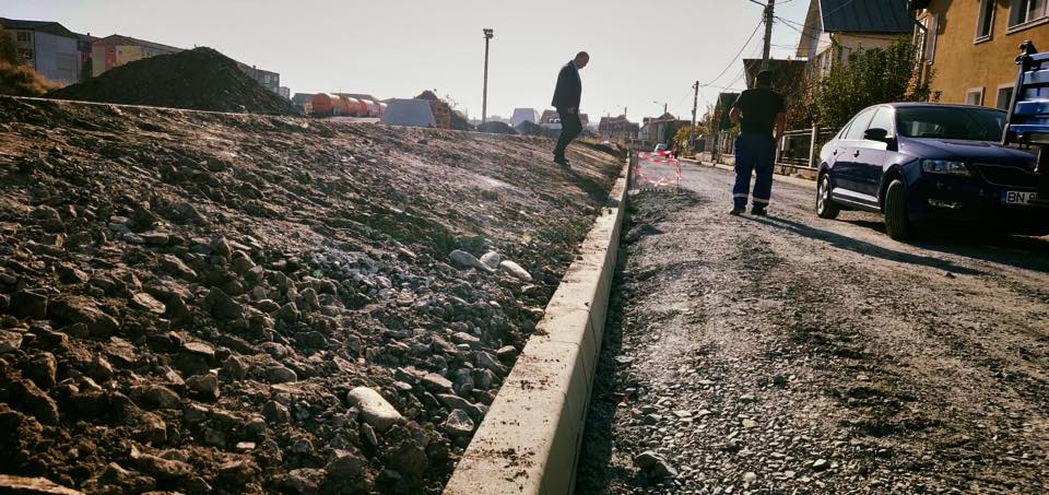 Pe strada Poienii din Bistrița se lucrează la amenajarea bordurilor și a zonei exterioare străzii, montarea gurilor de canal și a ultimului strat de piatră.