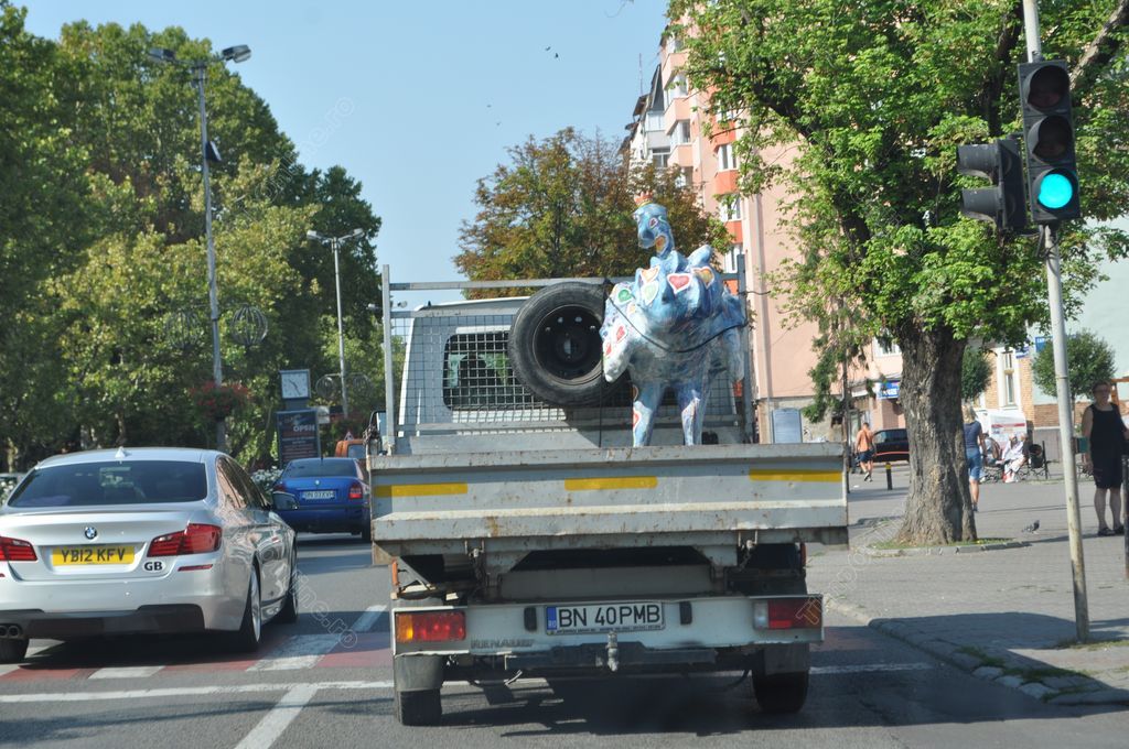 Struţul pictat în albastru cu picăţele aflat din 2011 în Piaţa Centrală a fost văzut vineri, la prânz, într-o maşină a Primăriei Bistriţa care rula pe Bulevardul Independenţei. Bine ancorată, figurina din fibră de sticlă pictată de elevii de la Liceul de Arte “Corneliu Baba”, a părăsit aşadar perimetrul central, îndreptându-se, aveam să aflăm, spre depozitele Direcţiei de Servicii Publice a Primăriei Bistriţa.